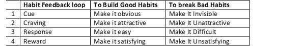 Rule 1 to 3 Increase odds of doing something now. Rule 4 increases odds of repeating that behaviour. The inversion of these rules helps breaking the bad habits.