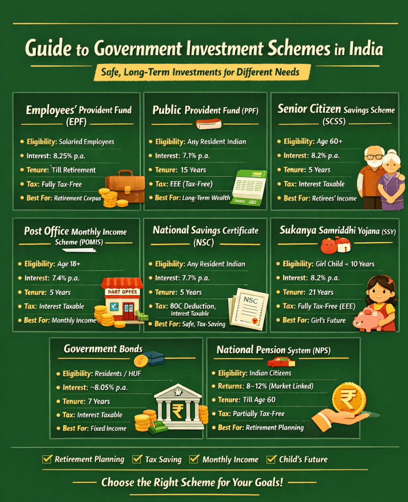Below is an overview of the key government investment schemes in India, who they are best suited for, and how to use them wisely.